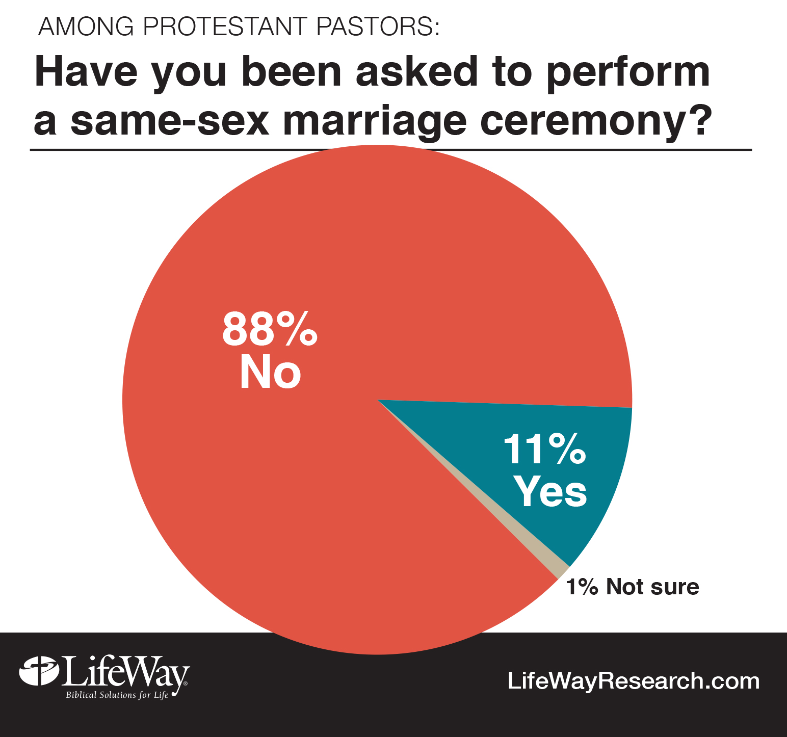 A 2016 LifeWay Research survey found that only 1 in 10 Protestant pastors had been asked to officiate a same-sex wedding. Presbyterian pastors received the most requests, at 1 in 4, followed by Lutheran pastors at 1 in 5.