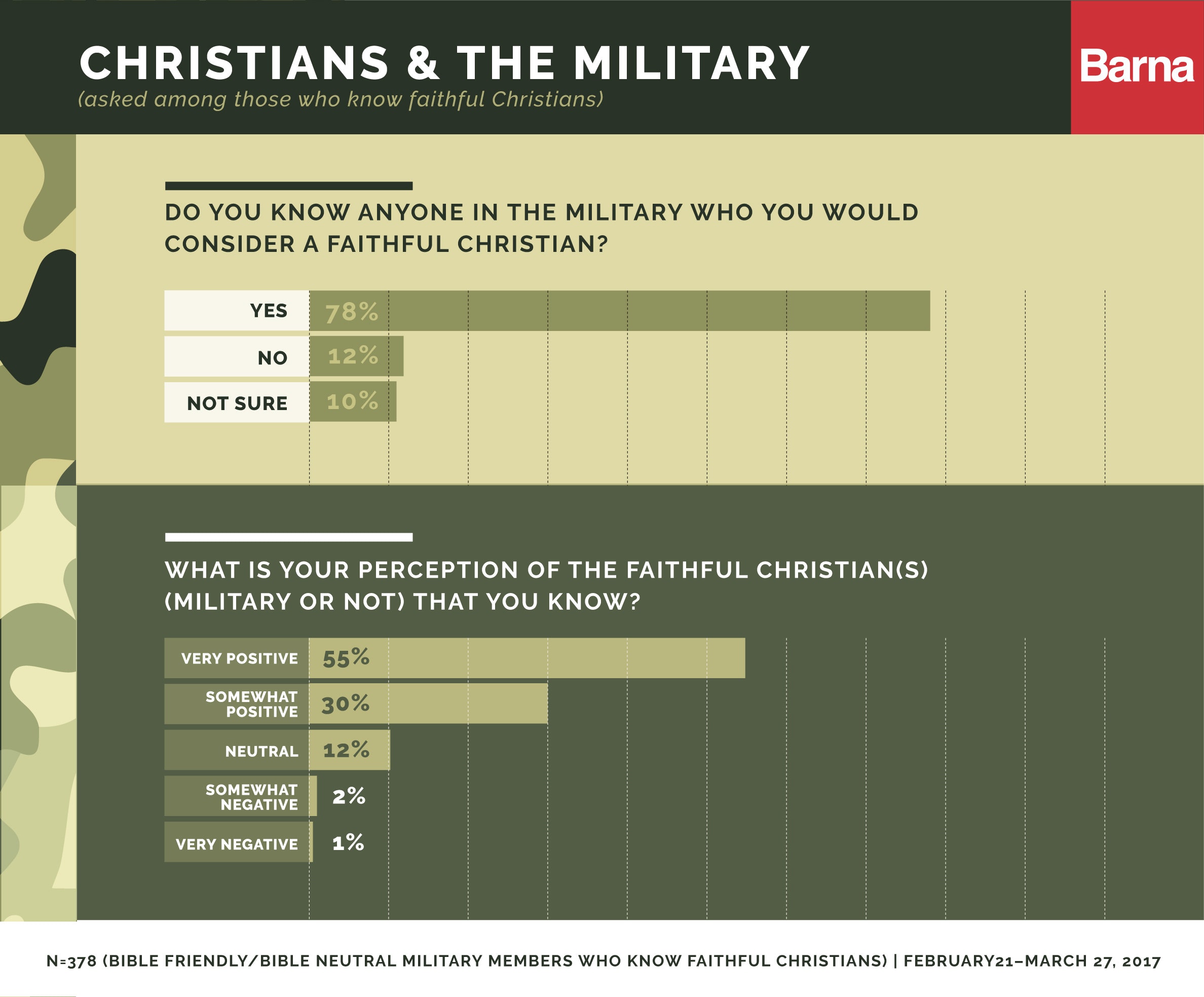 About 4 in 5 service members say they know faithful Christians serving alongside them in the military, according to Barna. A majority have a “very positive” perception of Christians, with 72 percent saying the believers they know reflect biblical ideals well.