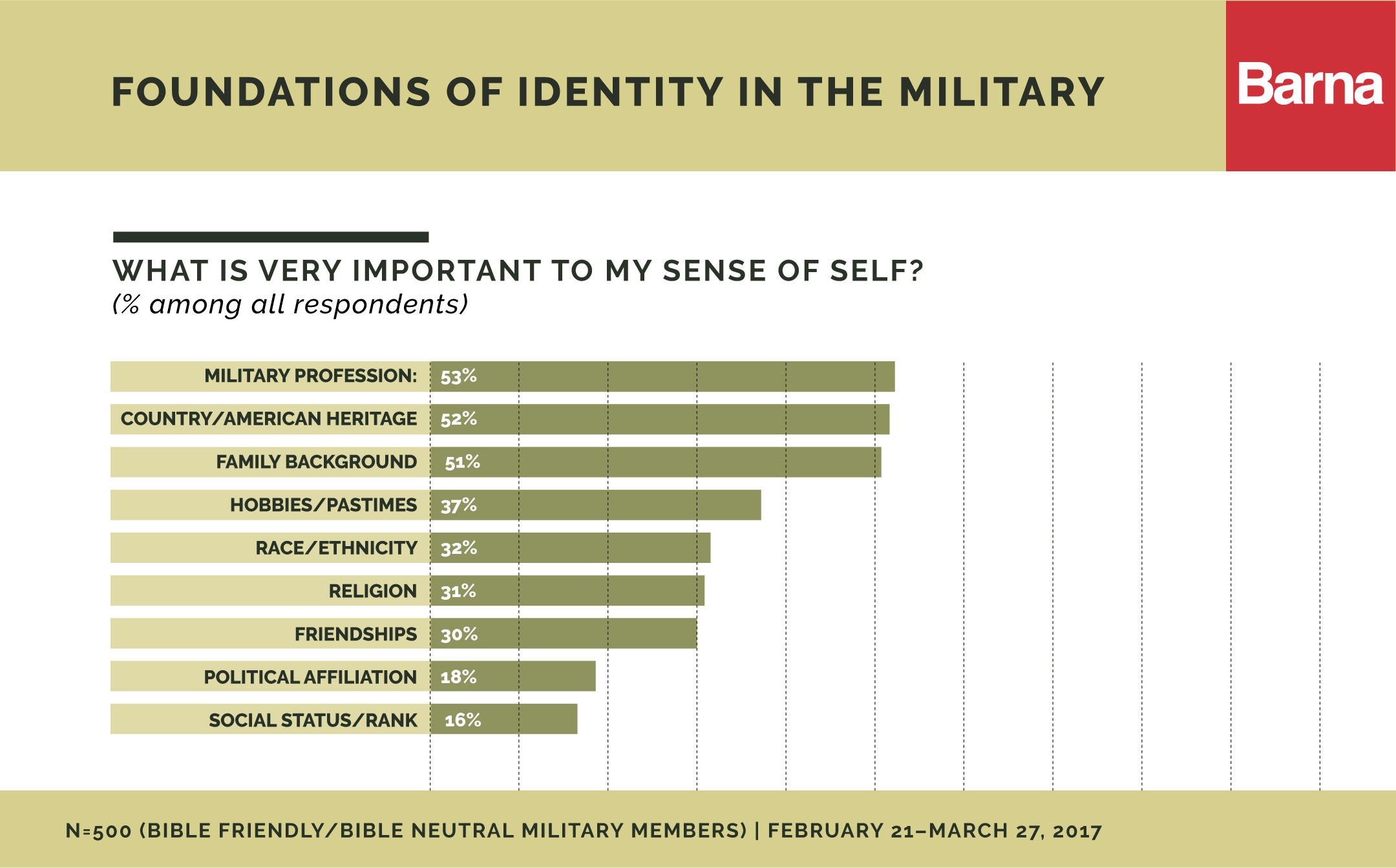 Currently, active-duty military personnel make up less than half a percent of the US population, and veterans make up about 7 percent. Service members consider their military affiliation and American heritage the most significant markers of their identity; over half ranked them as “very important,” compared to 31 percent who said their religion was very important, Barna found.