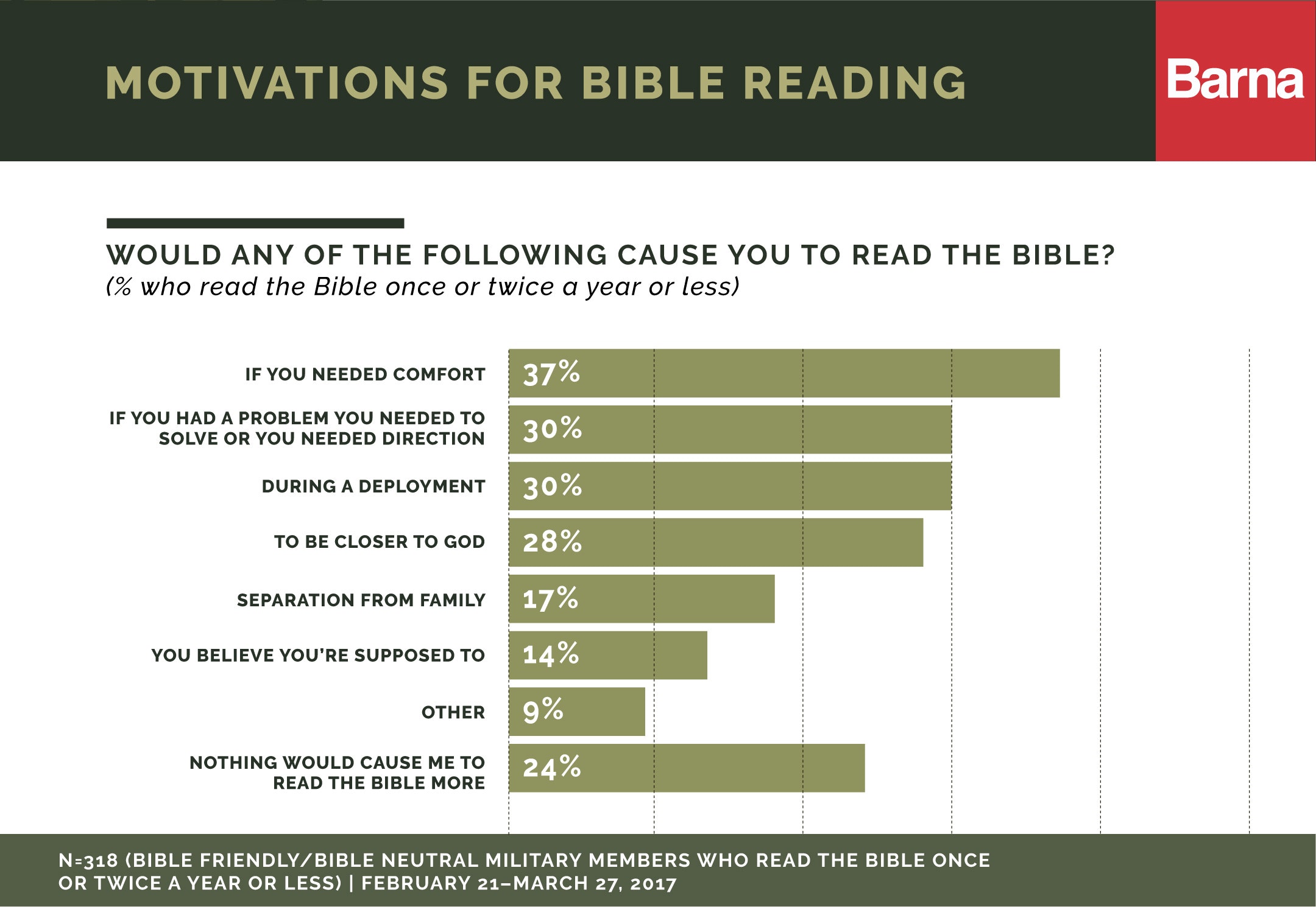 Researchers found that 37 percent of non-Bible readers in the military read the Good Book when they are looking for comfort, 30 percent read it during a deployment, and 17 percent read it when they are separated from family.