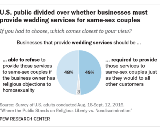 Americans are pretty evenly split over whether wedding vendors should be required to serve same-sex couples (49%) or should be able to decline on religious grounds (48%), according to a 2016 Pew Research Center survey. The groups most likely to say businesses should be able to turn down clients who conflict with their views were white evangelical Protestants (77%) and Republicans (71%).