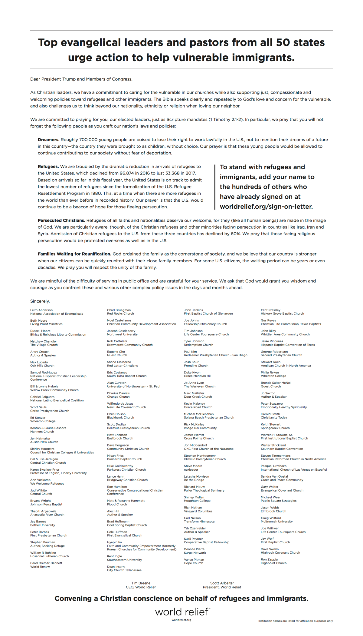 Rallied by World Relief, the humanitarian arm of the National Association of Evangelicals (NAE), the group took out another full-page ad in the newspaper to bring up multiple concerns related to immigration policy in 2018. [The ad appears at the end of this post.]