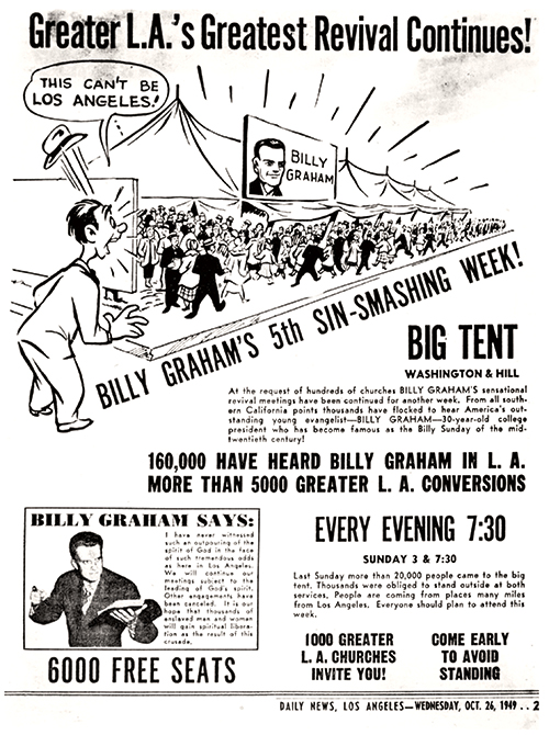 Billy Graham debuted on a national stage during his Los Angeles Crusade in fall 1949. Just 30 years old, Graham met his audience with a fiery call for repentance from sin, boldly announcing on the opening night that "this city of wickedness and sin" had a choice between revival and renewal—or judgment. At first, Los Angeles responded rather coolly to Graham's ire. But after a publicity boost from news magnate William Randolph Hearst, Graham's crusade entered its "5th Sin-Smashing Week!" A week later, the "Canvas Cathedral" overflowed as Graham presided over the "6th Great Sin-Smashing Week!"