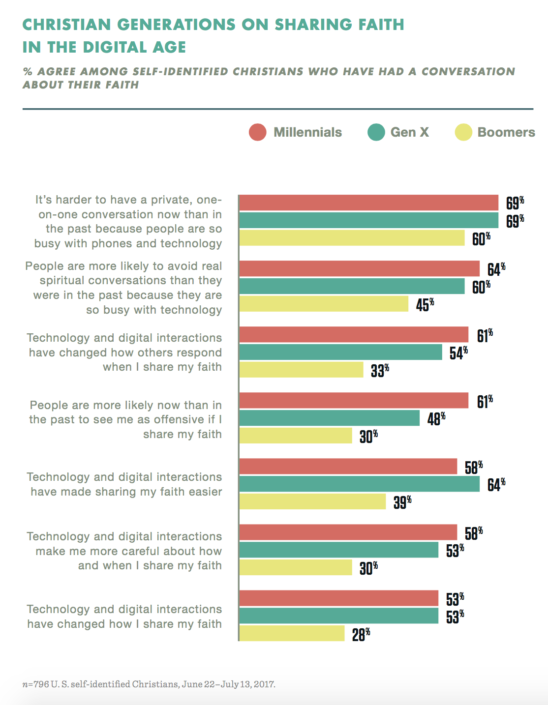 Millennials, now aged 20-34 in the Barna breakouts, experience the most pressure over bringing up their faith. They are the most likely to say digital interactions have made them “more careful” (58%) about talking about faith and to worry about their faith being seen as offensive (61%), according to the survey. (Youth ministry leaders, including groups like the Fuller Youth Institute, have recently developed resources specifically addressing the unique evangelism challenges teens and young adults face online.)