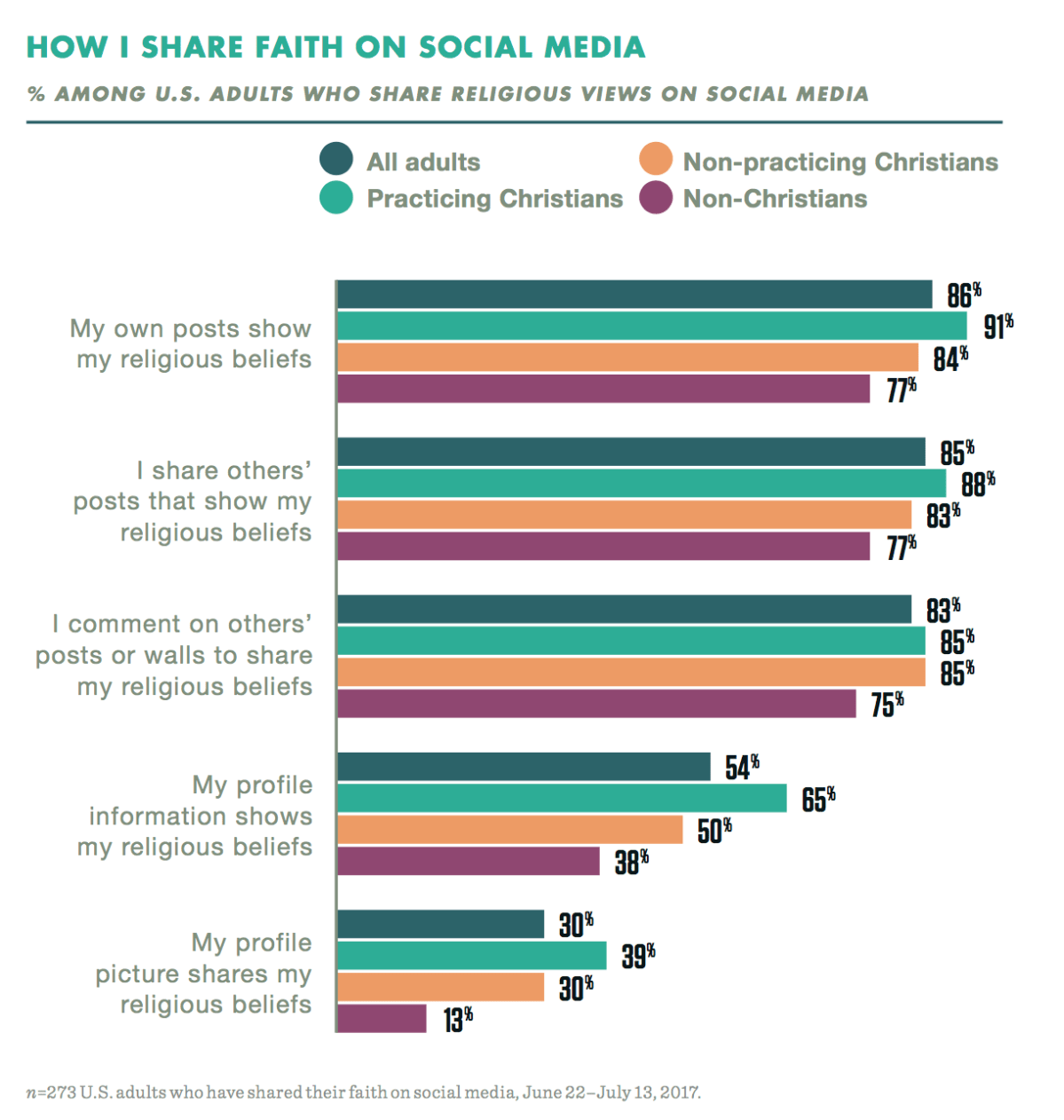 Among self-identified Christians, 28 percent use social media to share their faith. About 3 in 10 say they are as likely to share their religious beliefs online as in person, and about 1 in 10 say they are actually more likely to share them online.
