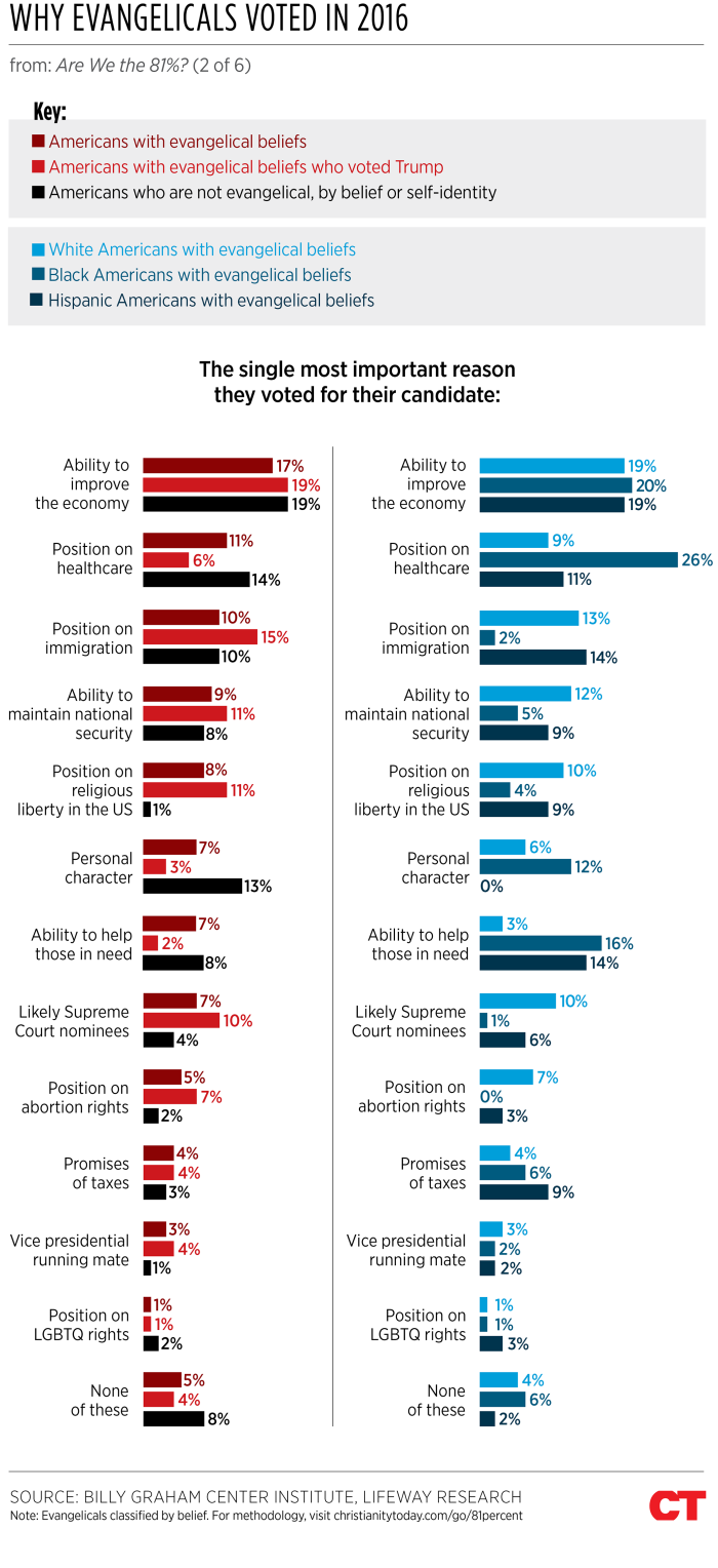The institute commissioned LifeWay Research to survey 3,000 Americans—including more than 1,000 with evangelical beliefs—in order to better understand how both white and non-white evangelicals made their choice in 2016. (While most surveys only focus on white and self-identified evangelicals, today 1 in 3 is a person of color and 1 in 3 is a Democrat.)