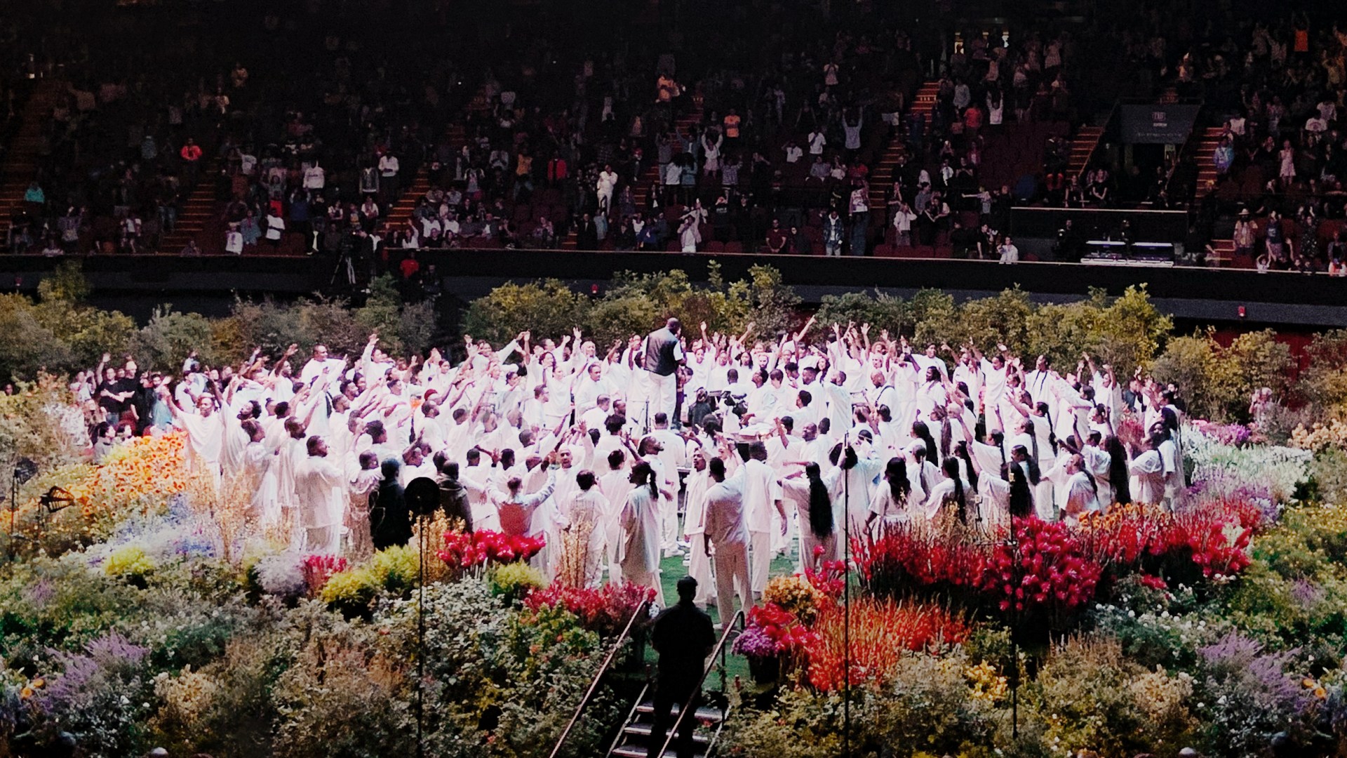 I chuckle at the transition. Scanning the stage, I look for the source of West’s voice, but struggle to spot him amongst the crowd of singers and instrumentalists. Suddenly, the blare of trombones reverberate through the arena and the previously standstill choir bursts to life. Their rhythmic bodies sway, and from afar they are a singular hypnotizing organism.