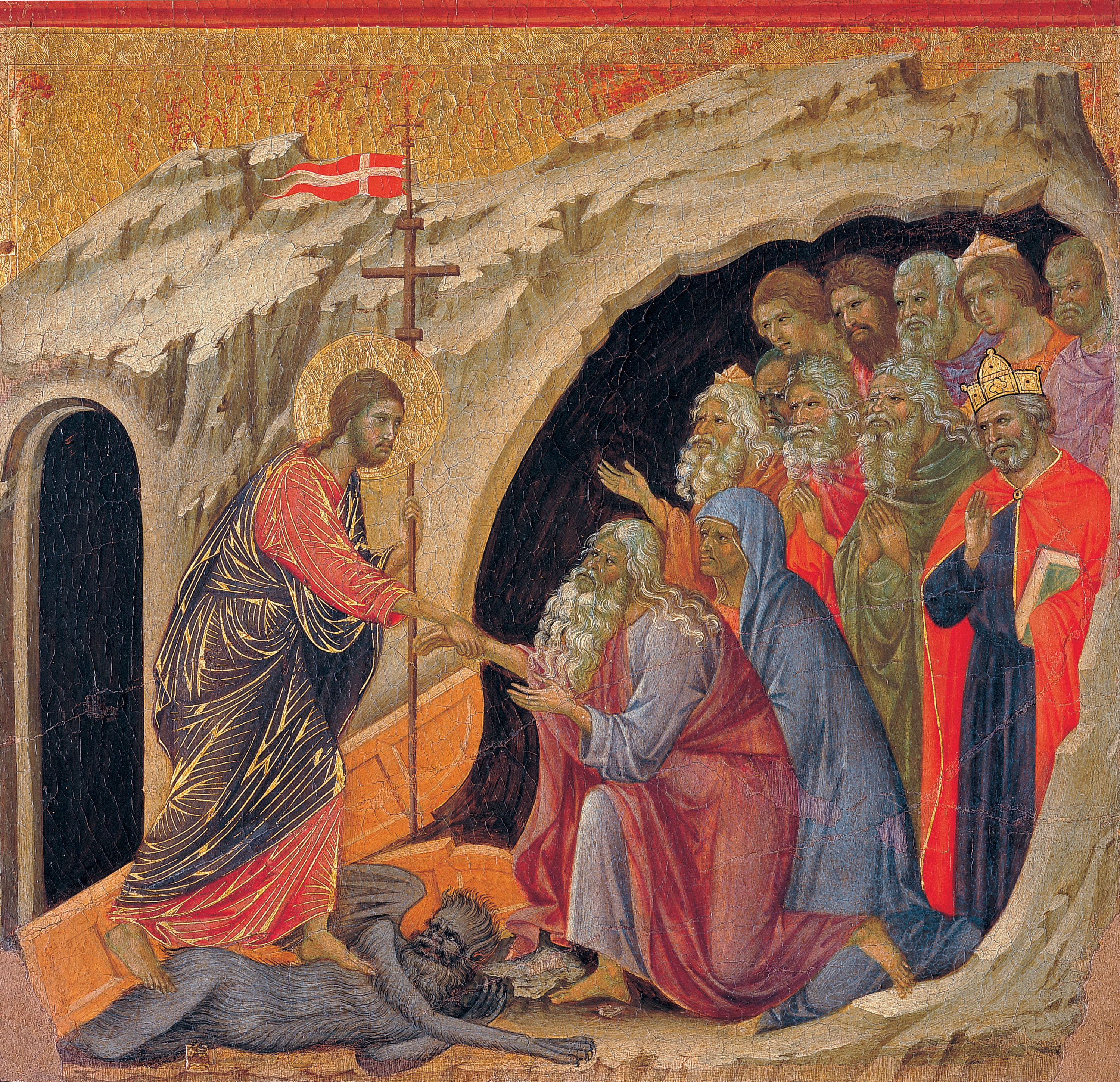 As a visual representation, consider the anastasis icon of the Maestà Altarpiece (1), from the 13th century. Less common today, works of art like this were traditionally placed behind the elements of the Eucharist on the altar. They bear collections of images that typically depict the entire life of Christ, from Gabriel’s announcement to Mary to Christ’s ascent and reign in heaven. The anastasis portion (named for the Greek word for resurrection) depicts Christ being raised from the dead.