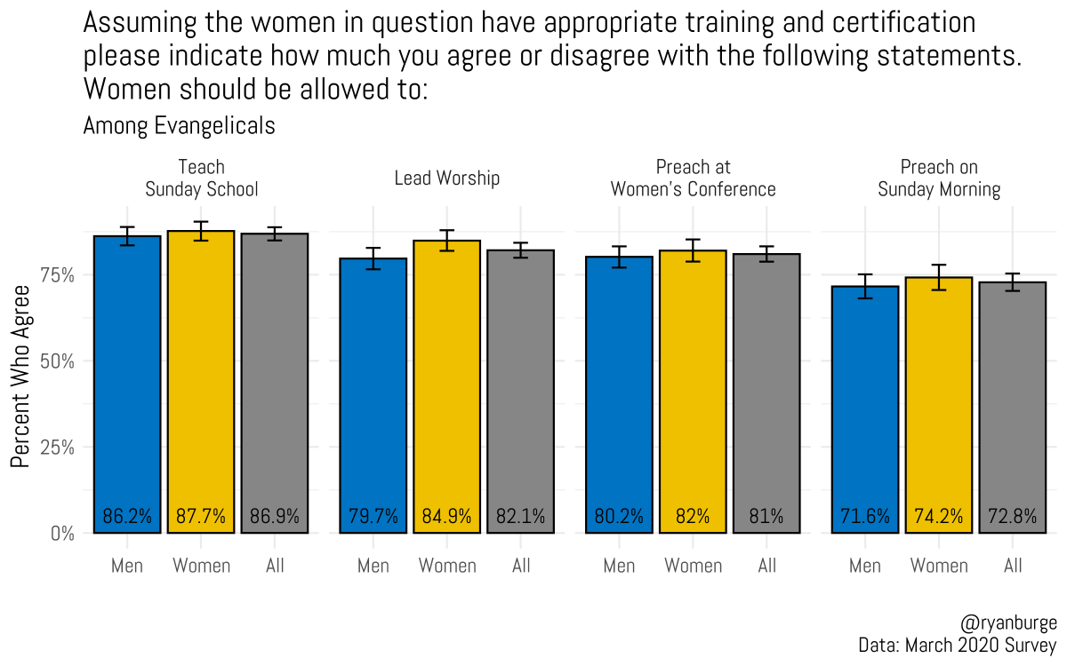 In a survey I fielded along with political scientists Paul Djupe and Hannah Smothers back in March, 8 in 10 self-identified evangelicals said they agree with women teaching Sunday school, leading worship at church services, and preaching during women’s conferences or retreats.