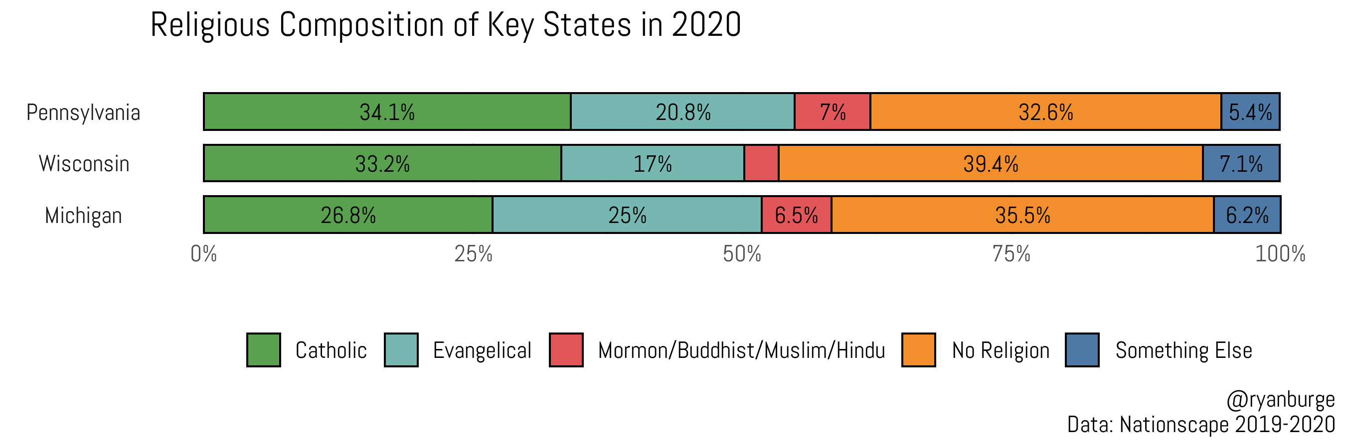 Donald Trump became the president of the United States because of fewer than 80,000 votes across the battleground states of Pennsylvania, Michigan, and Wisconsin. Thus, those three states are absolutely key for a reelection victory in 2020. The polling in Pennsylvania has consistently shown a significant lead for Joe Biden, with many results indicating that Biden may win the state by 7–8 percentage points. As I wrote back in September, white Catholic support will be a key factor and could swing to Biden in the Keystone State.