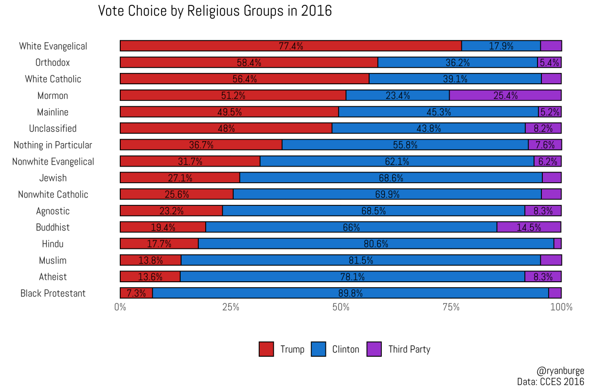 The reality is that the Election Day breakdowns will likely be good ballpark estimates but may not be exactly correct. For instance, analysis released the day after the election indicated that 81 percent of self-identified white evangelicals voted for Donald Trump. Data from larger academic surveys, which break down religious groups by church tradition, indicated it was closer to 77 percent of white evangelicals (similar to support for previous Republican candidates).