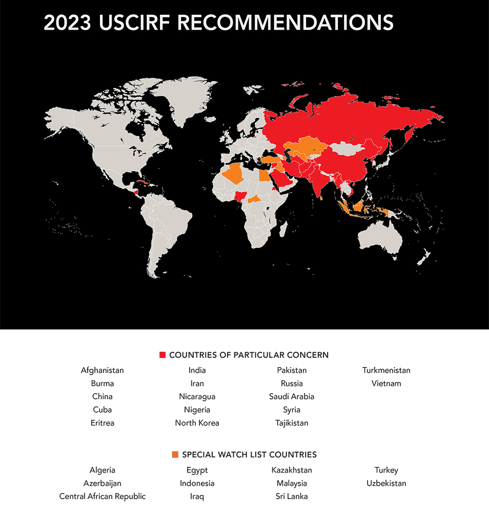 The commission recommends the US State Department relist Burma (Myanmar), China, Eritrea, Iran, North Korea, Pakistan, Russia, Saudi Arabia, Tajikistan, and Turkmenistan as CPCs, in addition to Cuba and Nicaragua. Afghanistan, India, Nigeria, Syria, and Vietnam were recommended for additional designation.