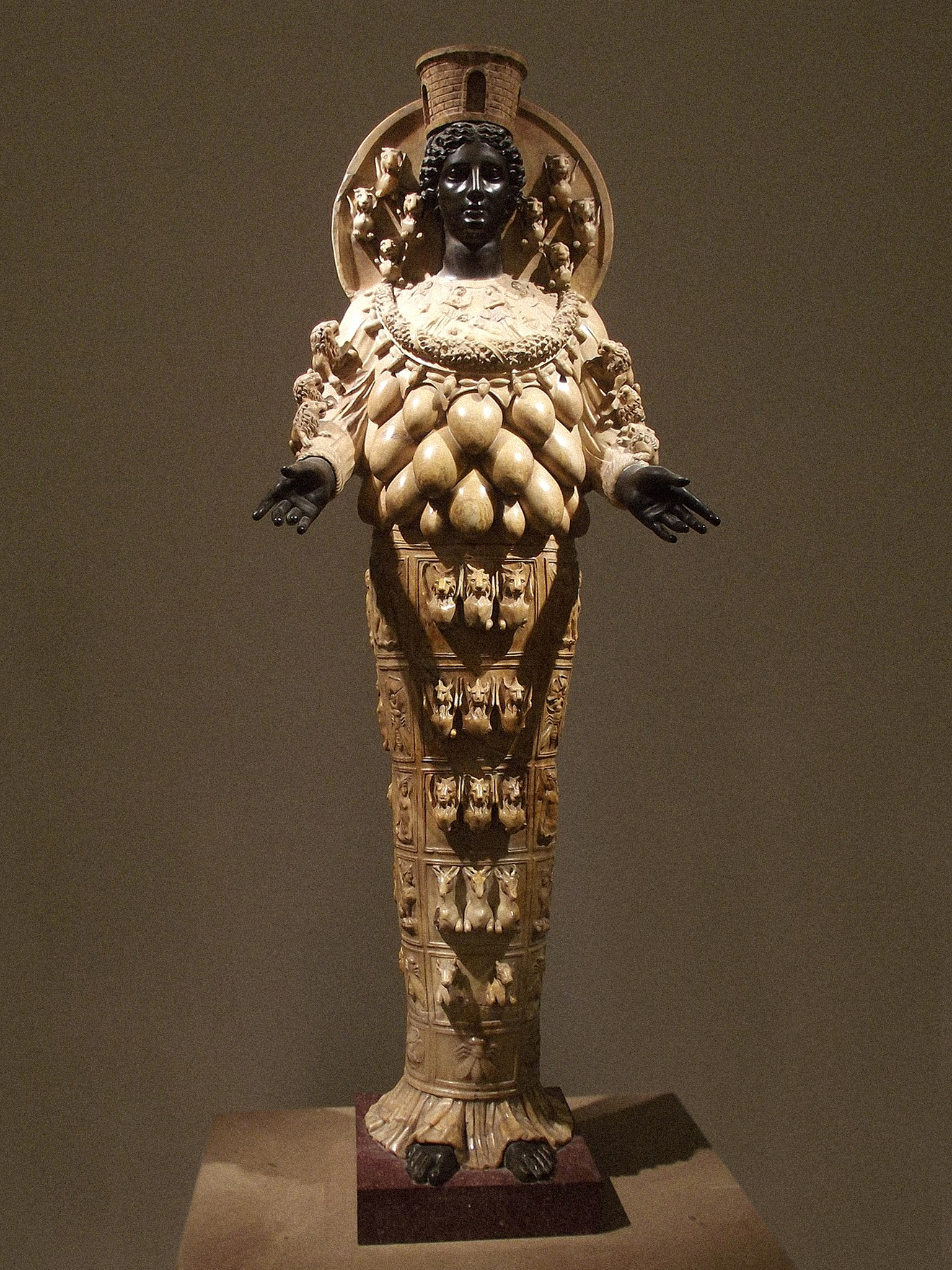 Though Glahn notes a relatively consistent portrait of Artemis in the literary sources and available epigraphs, the representations of Artemis in architecture and art are more varied. At times, she looks like an Amazon, a traditional beauty—adorned in jewels with braided hair. At other times, frankly, she looks strange, covered in ovoid shapes interpreted as breasts. But these images are not representative of different goddesses or divergent traditions. As Glahn notes, coins from that time period have one image of Artemis on the front and the other on the back. But the beautiful virgin hunter is certainly nobody’s mother, so what are we to make of those strange egg-like shapes?