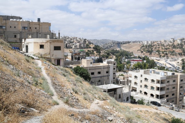 The Nazarene church sits a block off Marka’s main thoroughfare, a street that rides a ridge of hills, shuttling commuters in grimy white buses and green-tagged public transport vehicles between Jordan’s two largest cities, Amman and Zarqa. Restaurants, clothing and accessory stores, banks, pharmacies, and cell phone providers line the congested boulevard. On either side lie Marka’s residential buildings, limestone-faced apartments surrounded by olive trees and rows of scrappy cypress.