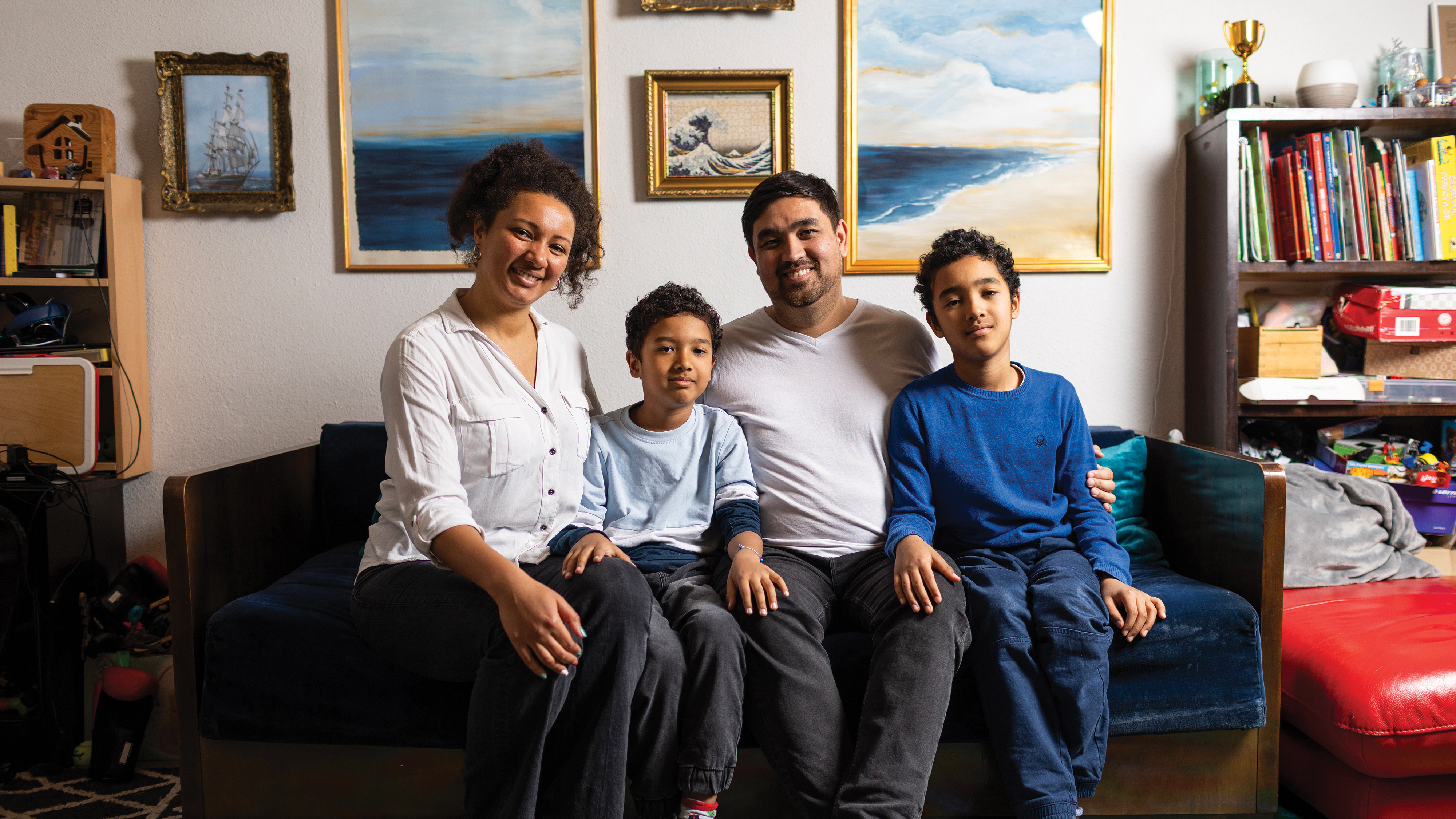 Damir Nurgaleev and Larianna Nurgaleeva sit with their children in the living room of their current home in Romania.