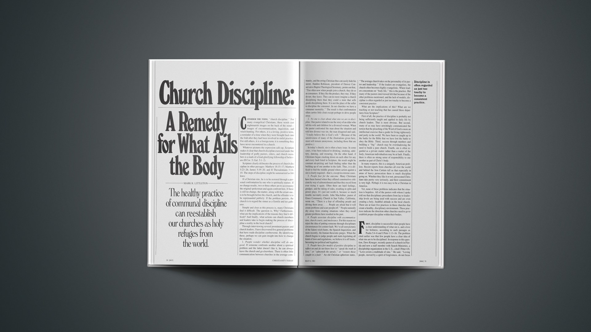 Consider the term, “church discipline.” For many evangelical Christians, these words cast nightmarish images on the back of the mind—images of excommunication, inquisition, and witch-hunting. For others, it is a loving, positive term, a reminder of a time when they were brought back into the fold after they had been involved in sinful practice. For still others, it is a foreign term; it is something they have never encountered in a church.