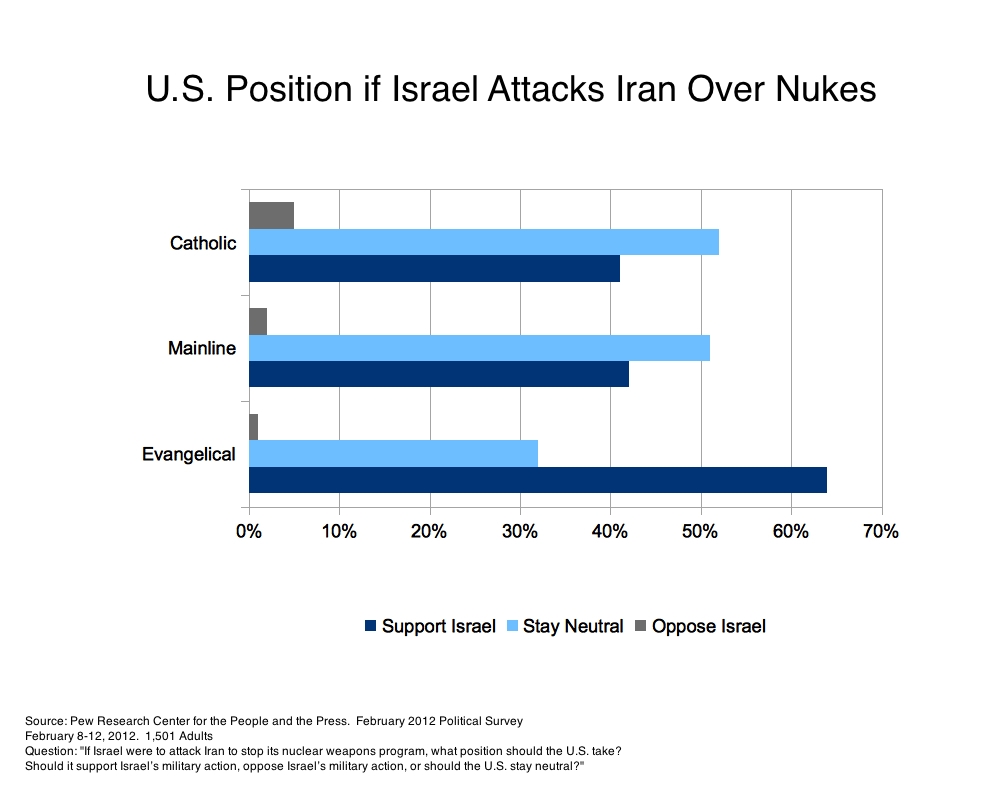 Among evangelicals, nearly two-thirds said the U.S. should support Israel if it attacked Iran. Evangelical support for the U.S. backing an Israeli attack was stronger than it was among mainline Protestants and Catholics, each of whom favored neutrality over support for Israel (52 percent to 42 percent).