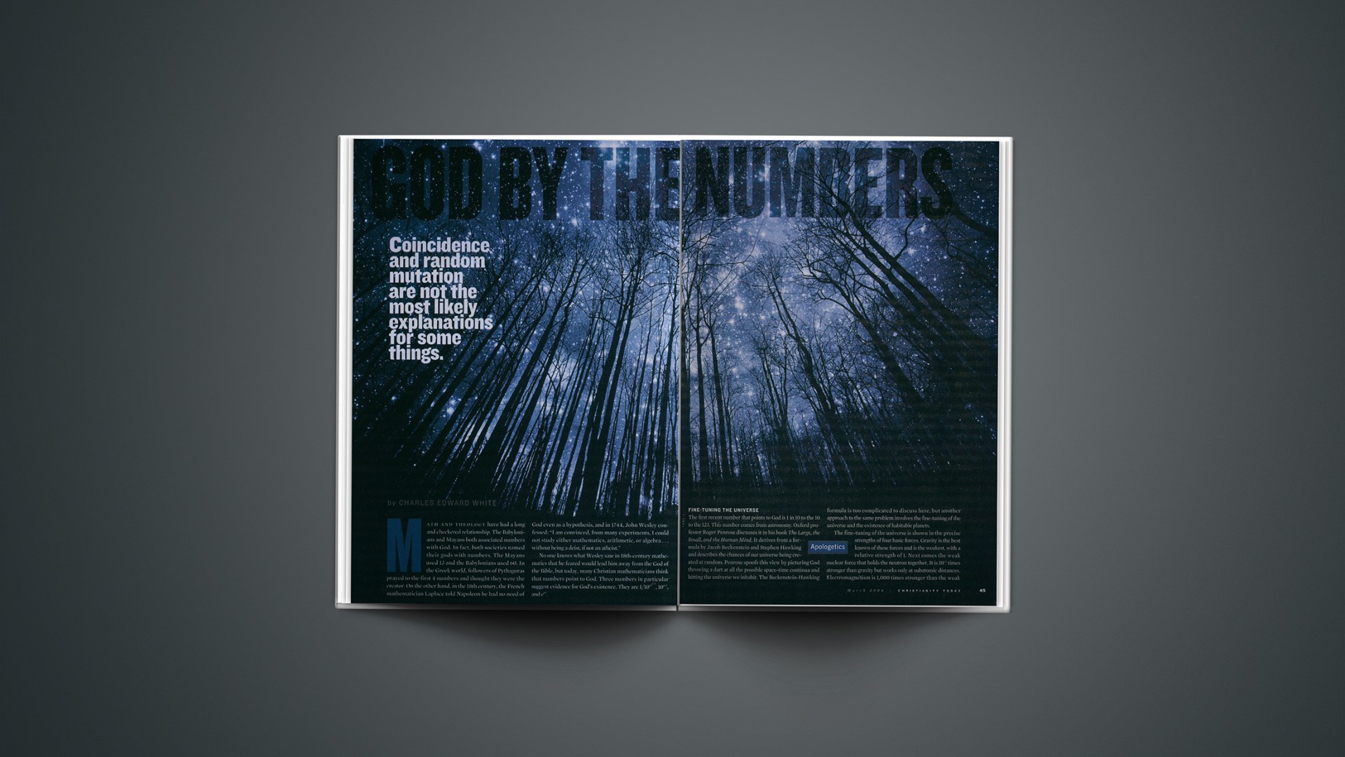 The first recent number that points to God is 1 in 10 to the 10 to the 123. This number comes from astronomy. Oxford professor Roger Penrose discusses it in his book The Large, the Small, and the Human Mind. It derives from a formula by Jacob Beckenstein and Stephen Hawking and describes the chances of our universe being created at random. Penrose spoofs this view by picturing God throwing a dart at all the possible space-time continua and hitting the universe we inhabit. The Beckenstein-Hawking formula is too complicated to discuss here, but another approach to the same problem involves the fine-tuning of the universe and the existence of habitable planets.