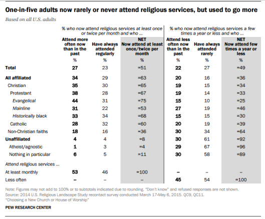 Of those who attend only a few times a year, 15 percent of both evangelicals and historically black Protestants said they’re attending less often than they did previously.