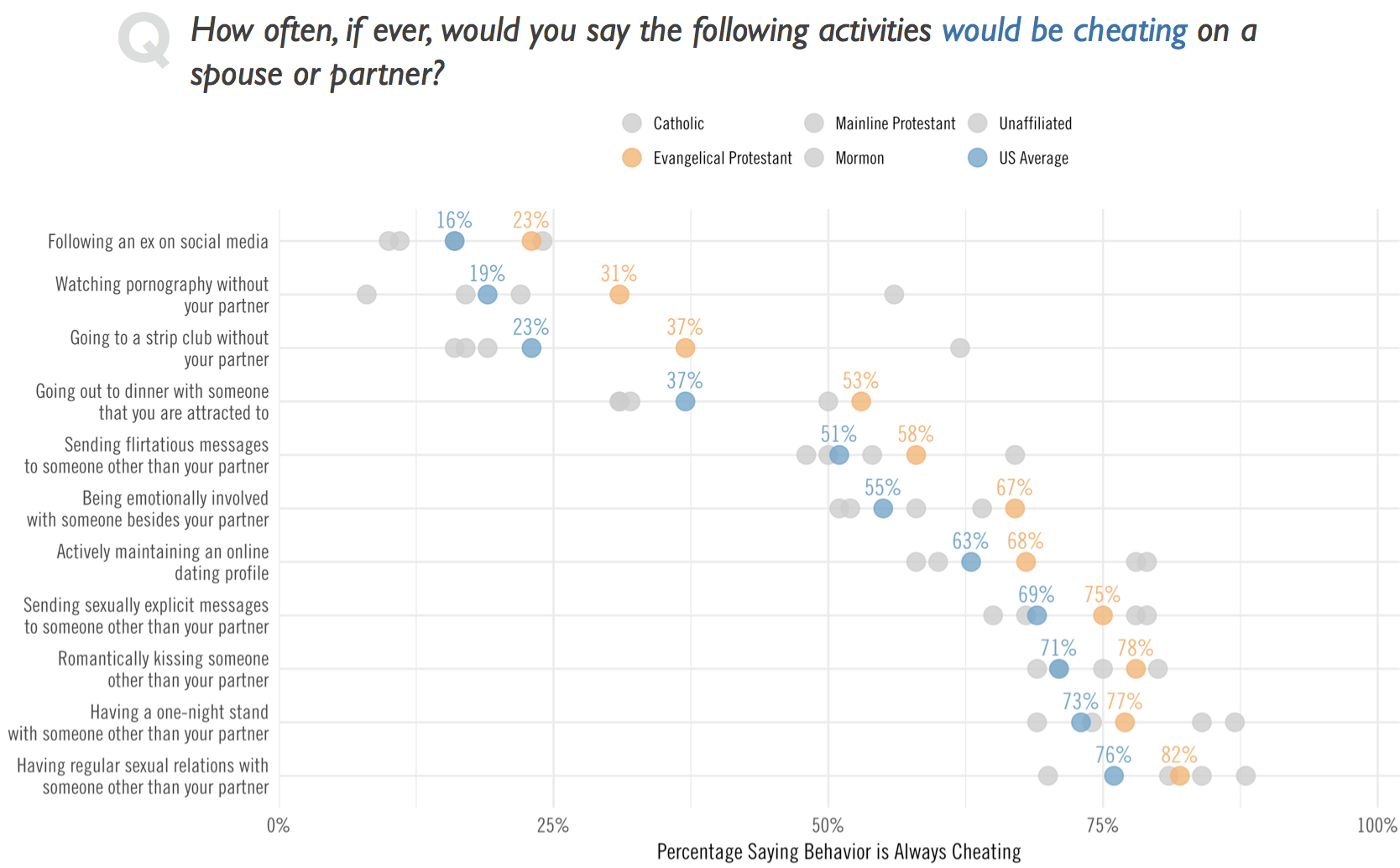 Across faith groups, there’s more consensus around physical contact. The vast majority of evangelicals consider sexual relationships (82%), one-night stands (77%), and kissing (78%) to be cheating.
