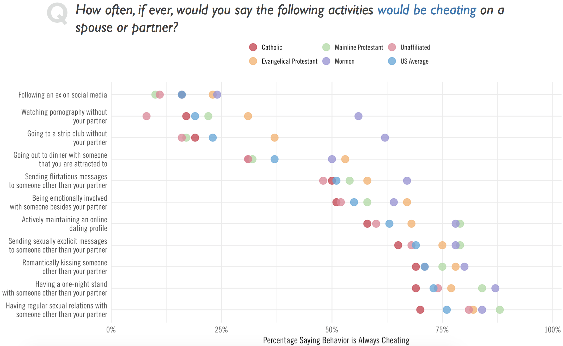 “The results of this survey reveal areas of uncertainty and different definitions of what constitutes cheating in the digital age,” said Allison Pond, a senior editor at Deseret News. “It shows how the Internet is adding a layer of complexity to the way we think about relationships.”