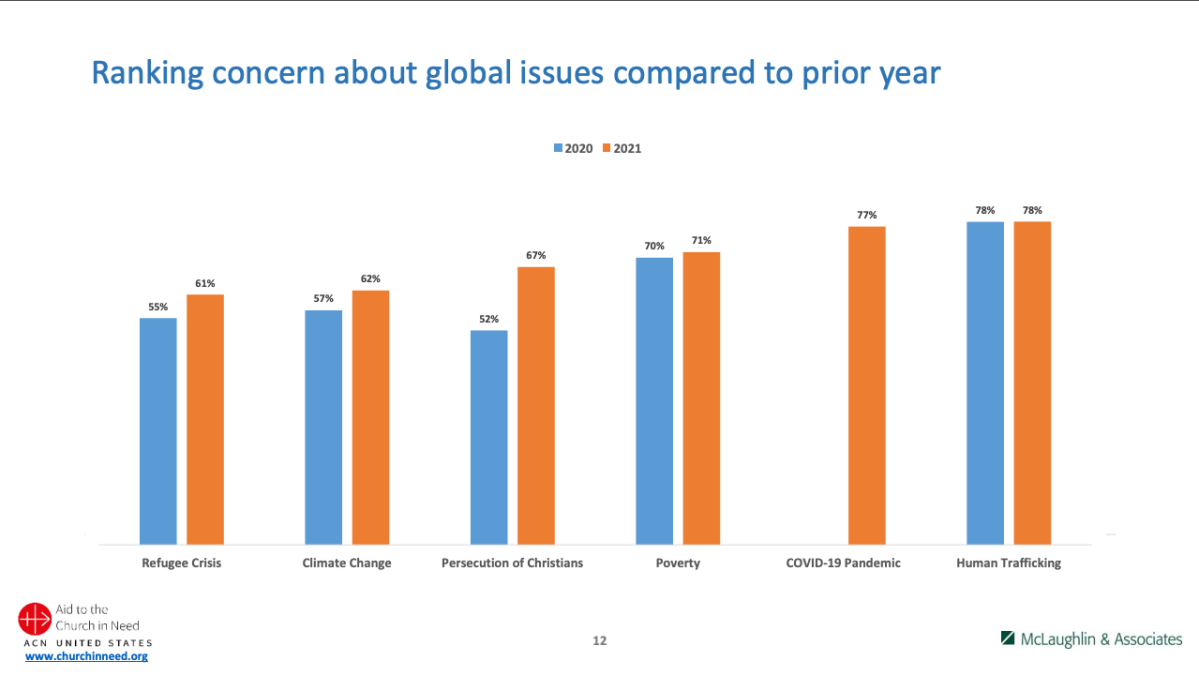 Human trafficking (78%) and poverty (71%) have held steady among top concerns, occupying first and second place in the yearly list. Persecution now ranks third, though concern for climate change (62%) and the refugee crisis (61%) have also risen (from 57% and 55%, respectively).