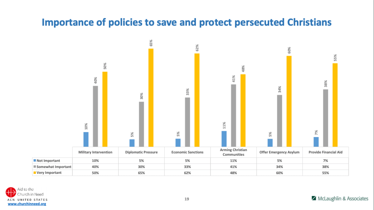 Militant options also grew in favor: Fifty percent said outside military intervention to protect persecuted Christians was “very important,” up from 46 percent, while 48 percent said the same for the provision of arms and training to communities facing genocide, up from 40 percent last year.