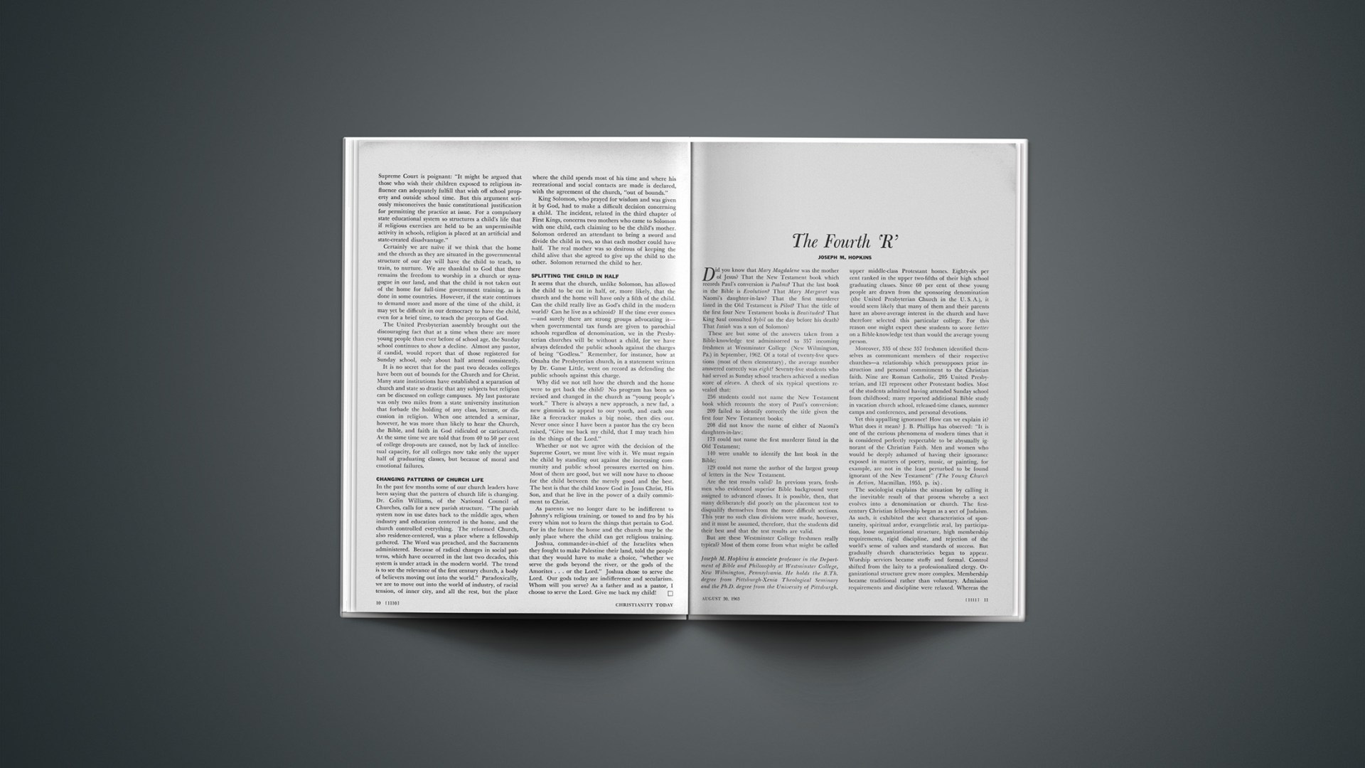 What is the answer? How can the Bible be elevated to at least the level of the arithmetic text? Certainly not by continuing to widen the gap between the sacred and the secular. This deplorable trend must be reversed. Only as the state declares itself honestly on the side of moral and spiritual values can the church and the home be expected to do an effective job of Christian education. This is no argument for a state church—or for the suppression of religious or anti-religious minorities. Such a declaration, rather, is the acknowledgment that faith in God is the will of the people and therefore the official policy of government.