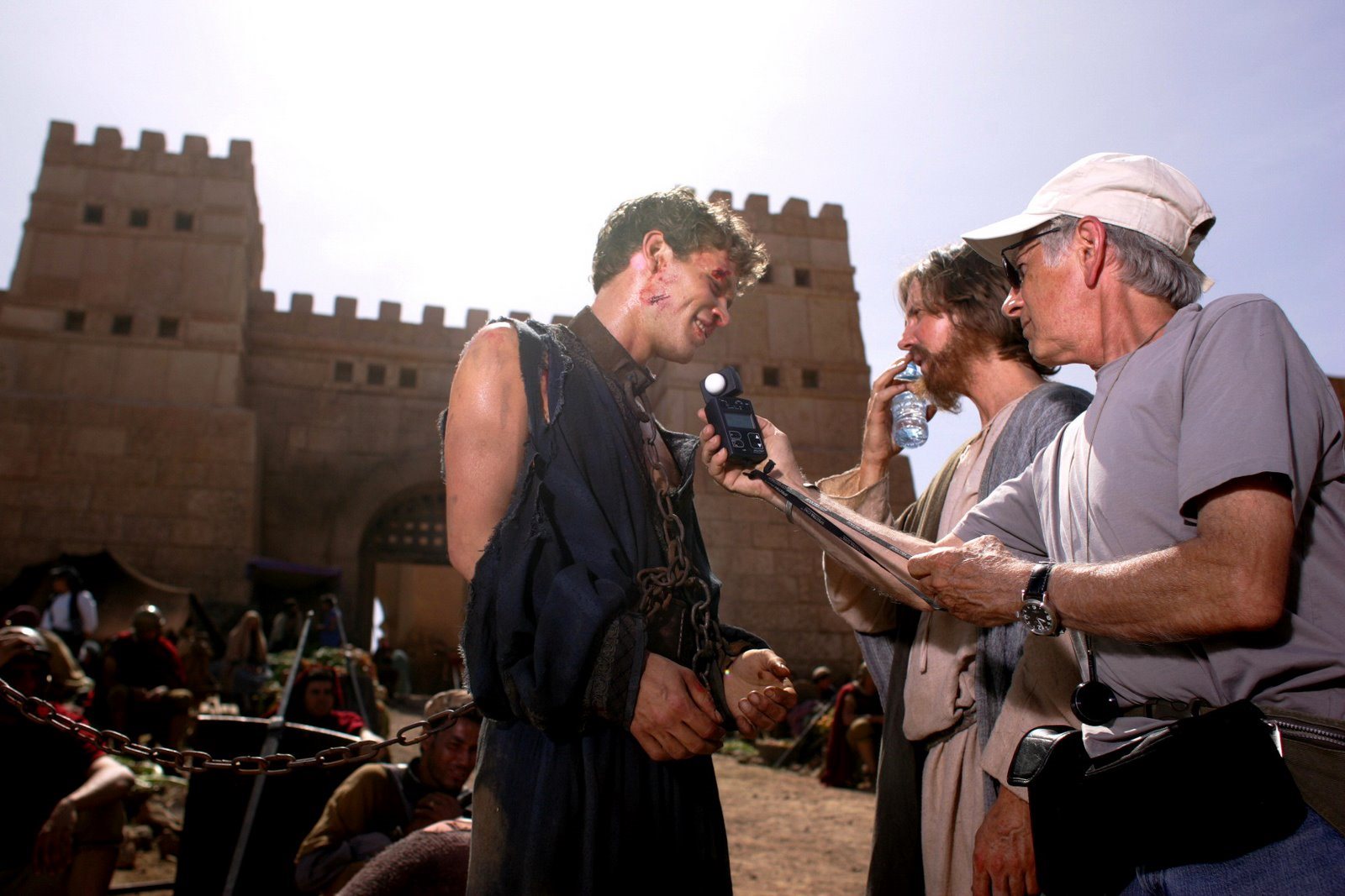 Note also that the actor playing Jesus is holding a water bottle. That's kind of funny, since it looks like the scene they are working on is the one in which Jesus gives Judah a drink of water – but presumably out of a gourd or some similar vessel, and not a plastic bottle!