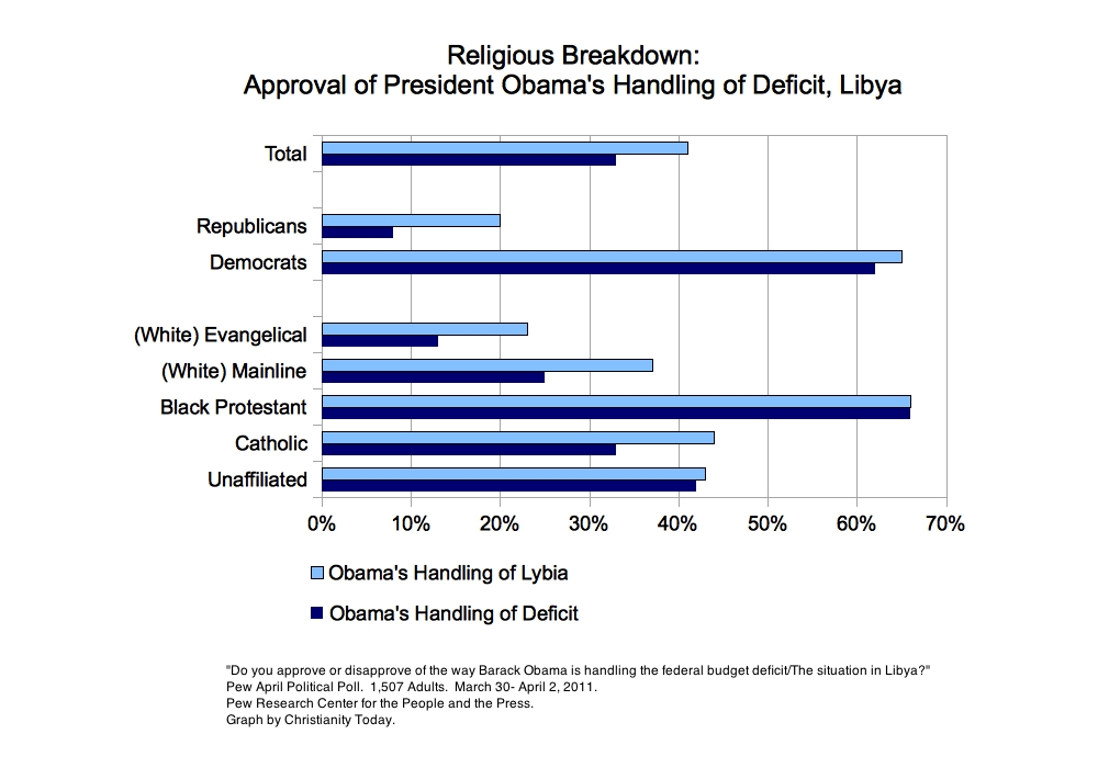 Evangelicals were similarly disapproving of Obama. Only 13 percent approved of his handling of the deficit; 25 percent approved of his job on Libya. This was lower than approval ratings for other religious groups, though mainline Protestants and Catholics showed a similar pattern of having higher approval for Libya than the deficit. Black Protestants and those who are not affiliated with a religious tradition showed the same level of support for Obama’s handling of both issues.