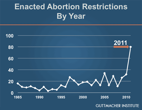 States have enacted a record number of state laws restricting abortion in 2011. The Guttmacher Institute, a pro-choice research organization, reports that in the first six months of this year, there have been 80 state laws that restrict abortion.