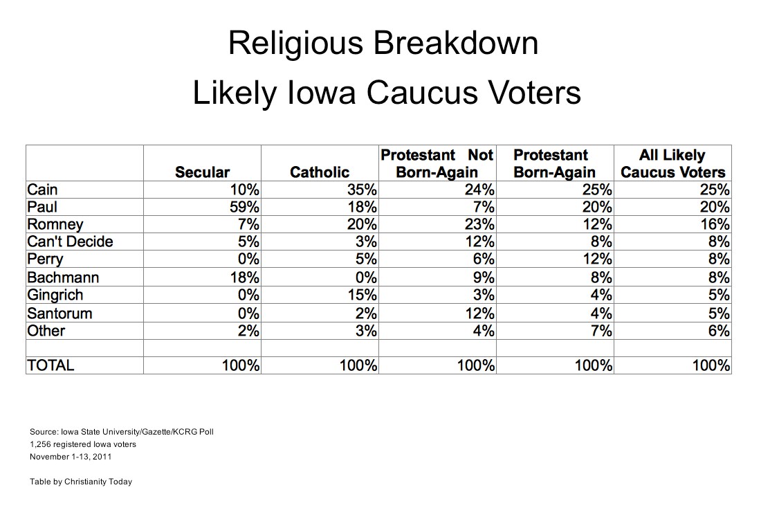 Herman Cain received the most votes among Catholics (35 percent) and Protestant/born-again (25 percent), but he has very little support among secular voters (10 percent). Secular voters represent a small portion of caucus voters, but they are the most unified with six-in-ten of them backing Ron Paul.