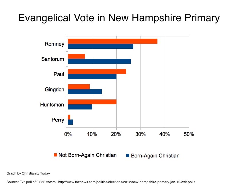 Mitt Romney won the New Hampshire primary. His margin of victory may have been smaller than predicted, but there was one surprisingly strong result: Romney tied Rick Santorum for the lead among evangelical voters (around 26 percent each). Romney did twice as well among born-again Christians in the Granite State than he did last week in the Hawkeye State.