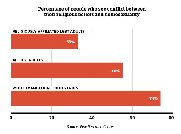 Of LGBT adults with religious affiliations, 1 in 3 believe there is a conflict between their religious beliefs and their sexual orientation (vs. only 18 percent of the unaffiliated).