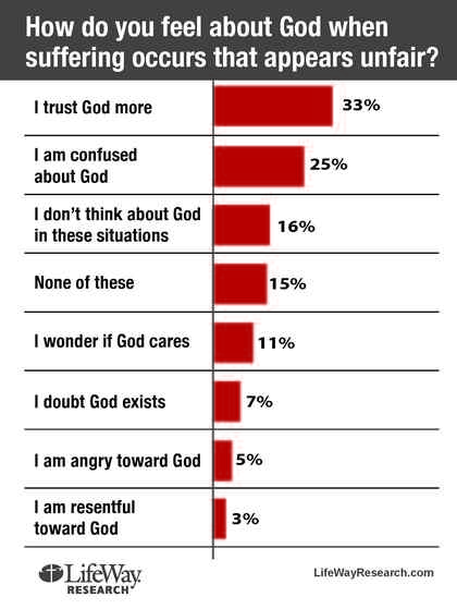 The full report suggests that 1 in 3 people say they “trust God more” in the midst of suffering caused by natural disasters. Another 1 in 4 people report being “confused by God,” but only 1 in 10 wonders “if God cares.” (See full infographic below.)