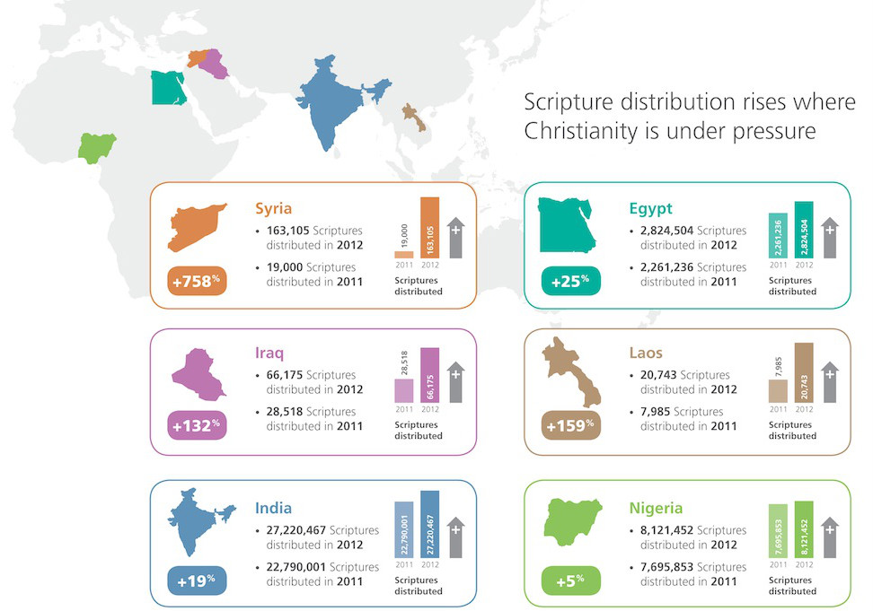 For example, the country with the highest increase of Bible distribution from 2011 to 2012 is Syria, which recently leapt from No. 36 to No. 11 on the WWL. While the nation's Bible society distributed 19,000 Scriptures in 2011, it distributed 163,105 in 2012—a 758 percent increase. (Many of those products were Scripture calendars and books for Christmas and Easter.)