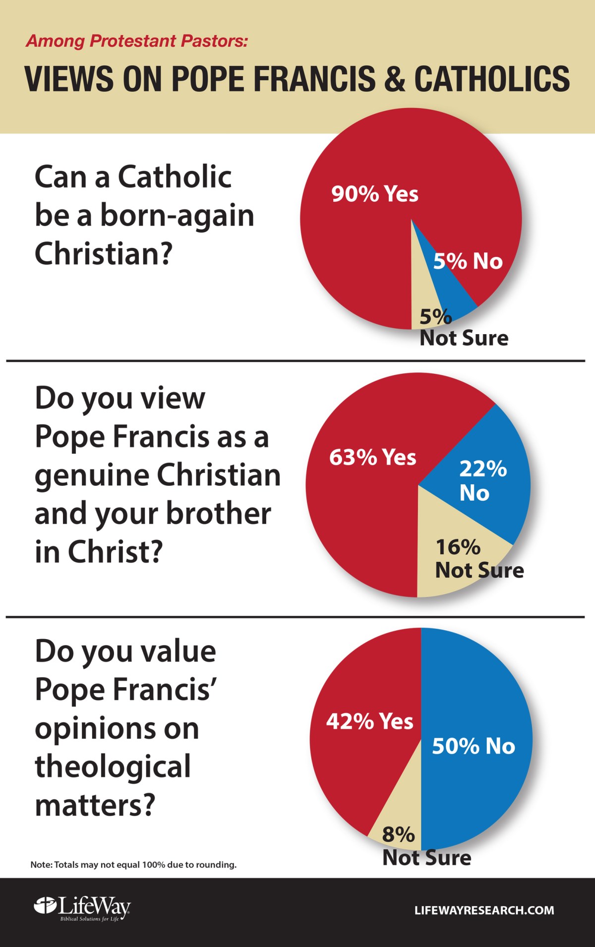 On whether Catholics can be “born-again Christians,” 90 percent of Protestant pastors and 92 percent of evangelical pastors agree. But they are less certain whether the pope is their brother in Christ: 63 percent agree Francis is a genuine Christian, 22 percent disagree, and 16 percent are unsure.
