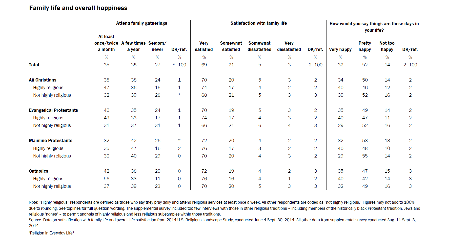 Beyond that, the everyday lives of the highly religious look a lot alike. More than 80 percent are very happy or pretty happy with their lives overall; more than 90 percent are satisfied with their family life.
