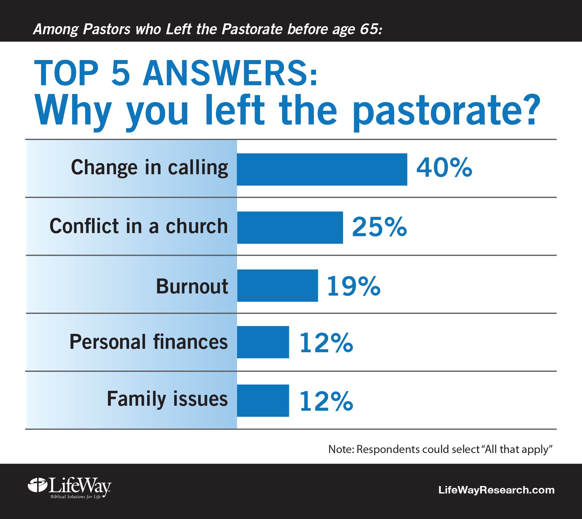 Forty percent say they left the pastorate because of a change in calling. They also cite such issues as church conflict (25%), burnout (19%), personal finances (12%), and family issues (12%).