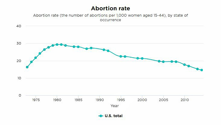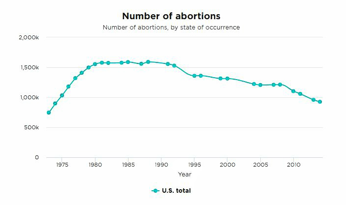 The abortion rate reached its zenith at 29.3 in 1980 and 1981, and the total number of abortions peaked at more than 1.6 million in 1990, according to Guttmacher.