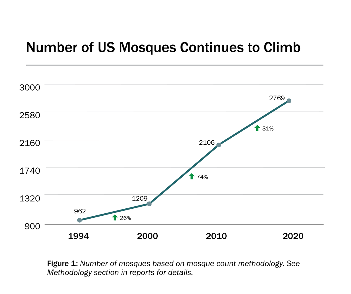 The survey counts 2,769 mosques in the United States, an increase of 31 percent since the 2010 report. The prior decade had a growth rate of 74 percent, from 1,209 mosques counted in the 2000 report to 2,106 in 2010.