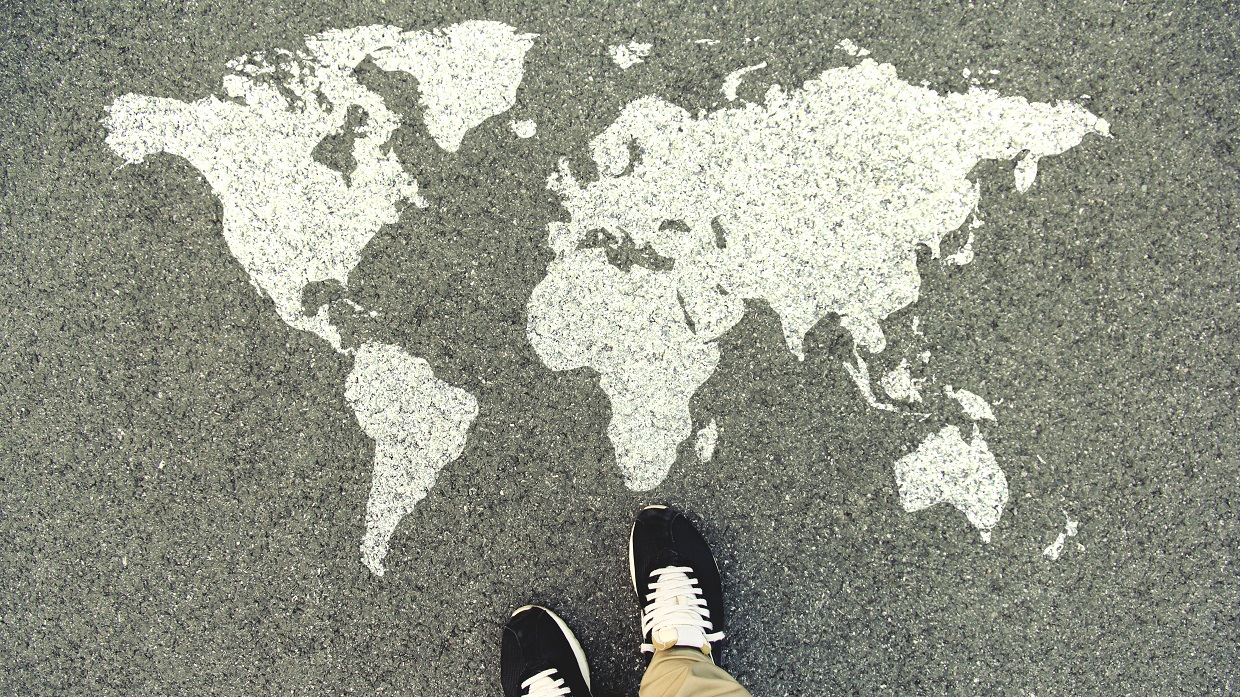 World map on an asphalt road. Top view of the legs and shoes. POV