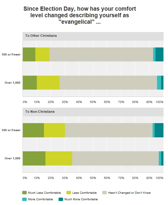 According to our study, leaders from small churches (100 or fewer) tend to be more comfortable with evangelical than those from large churches (1,000 or more). Only 9 percent of small-church leaders feel strongly uncomfortable using the term with non-Christians (compared to 22% of large-church leaders). On the other end of the scale, 28 percent of small-church leaders feel strongly comfortable using the term outside their Christian communities (only 13% of large-church leaders feel the same). And a higher percentage of large-church leaders report feeling less comfortable with the term since the election (26% to 19%). Why?