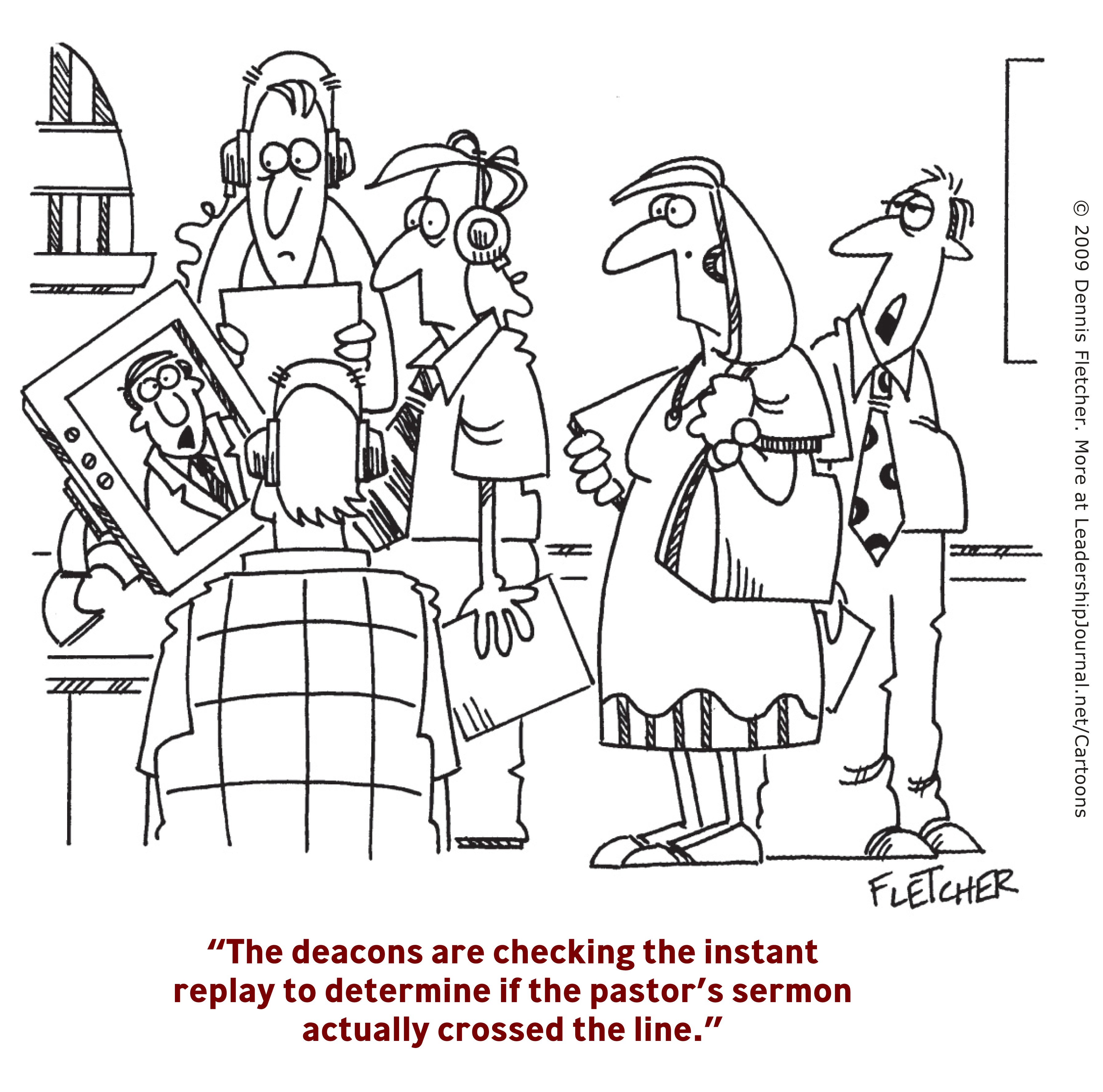 The deacons are checking the instant replay to determine if the pastor's sermon actually crossed the line.
