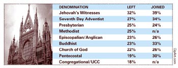 Who’s moving: The shift is greatest among mainliners, smaller faiths and sects. Jehovah’s Witnesses are most “mobile.” Accounting for less than 1 percent of American adults, one-third of their members leave the group, and two-fifths join from another religion.
