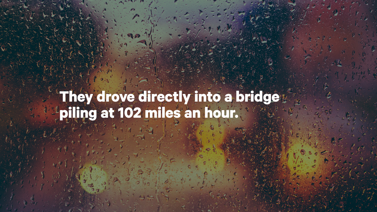 The couple was dead. They fled their home Tuesday night, abandoned it like a house on fire, and drove 500 miles and booked into a seedy hotel. They got up early the next morning and drove directly into a bridge piling. The forensic report estimated the car was traveling at 102 miles an hour. The coroner said the husband and wife died instantly, their daughter an hour later.