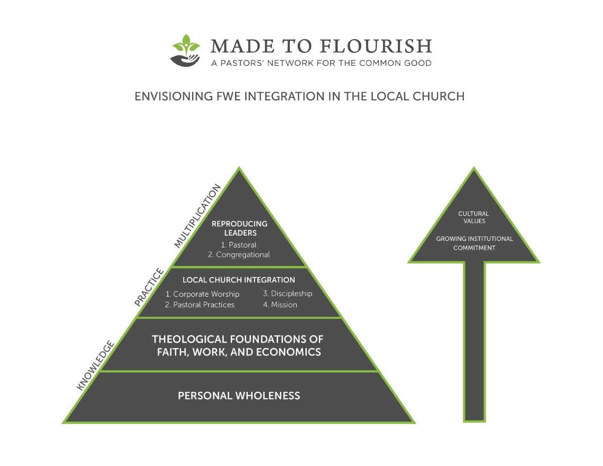 The following diagram illustrates the way we envision faith, work, and economic (FWE) integration in the local church. At the foundational level, we seek to serve pastors by encouraging the move toward personal wholeness. This is followed by teaching our pastors a robust FWE theology. Our hope is that these same pastors will prayerfully and imaginatively seek ways to integrate this theology into their respective congregations through four main “arteries”: pastoral practice, corporate worship, discipleship/spiritual formation, and outreach/missions.