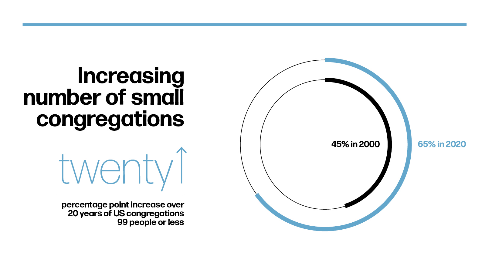 Churches with fewer than 100 in attendance often face existential challenges. They are more likely to have part-time, unpaid, or bivocational pastors and spend the largest percentage of their budget on their facilities. Among churches with less than 50 in attendance on a Sunday morning, 65 percent have declined by 5 percent of attendees or more in the past two decades.