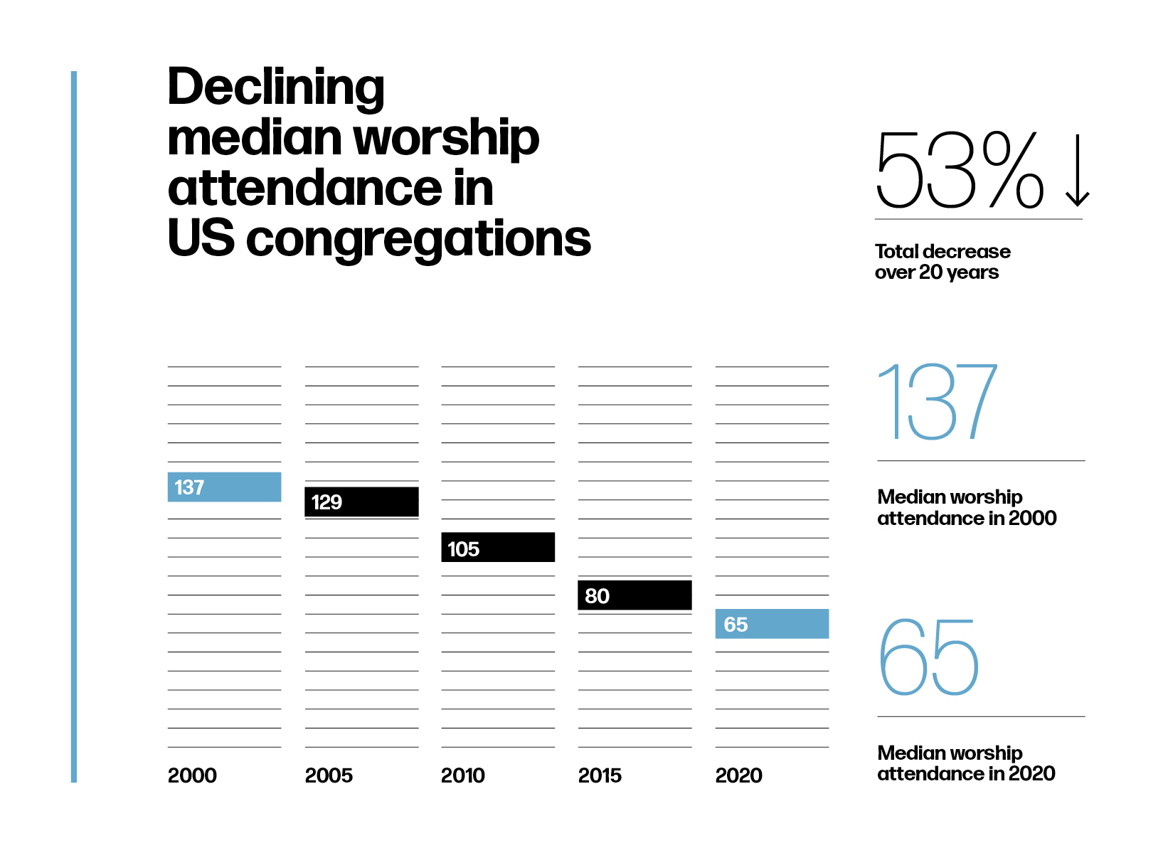 The average crowd at church on a Sunday morning is half what it was 20 years ago. In 2000, the median worship attendance at US congregations was 137; now it’s down to 65. As church attendance shrinks, small congregations make up a growing portion of the US religious landscape. In 2000, 45 percent of churches had fewer than 100 in weekly attendance. That has climbed to 65 percent.