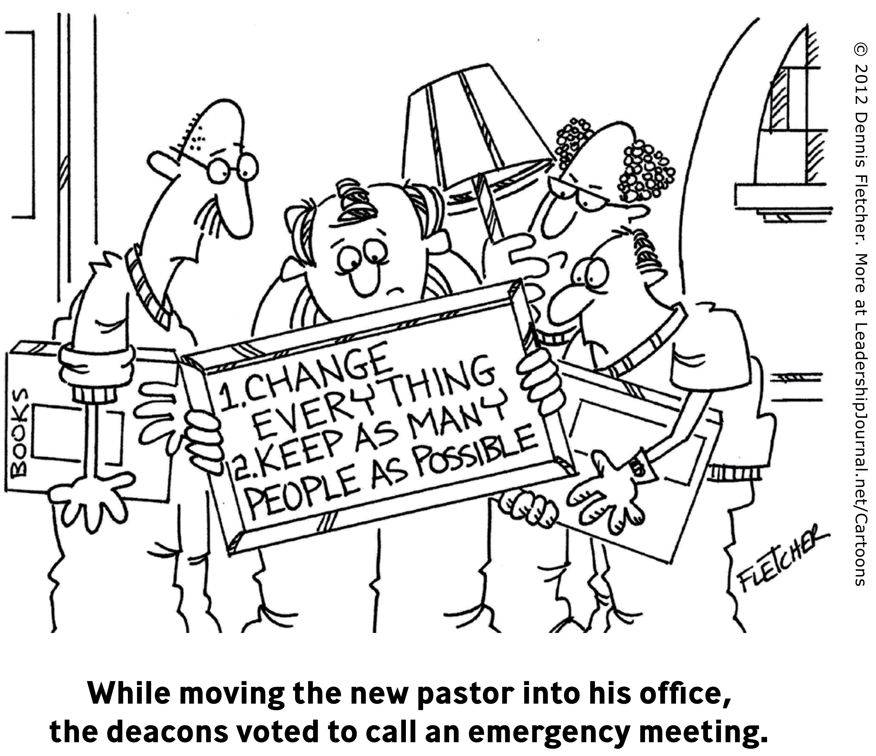 While moving the new pastor into his office, the deacons voted to call an emergency meeting.